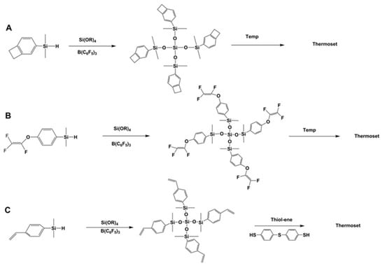 Three examples of the synthesis of multi-arm siloxanes with different thermolabile groups and their conversion to highly cross-linked carbo-siloxane materials. (A)—Benzocyclobutene group; (B)—Trifluorovinyloxyphenyl group; (C)—p-Vinylbenzene group.