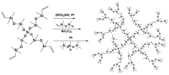 - Grande, J.B.; Urlich, T.; Dickie, T.; Brook, M.A. Silicone dendrons and dendrimers from orthogonal SiH coupling reactions. Polym. Chem. 2014, 5, 6728–6739. [Google Scholar] [CrossRef]