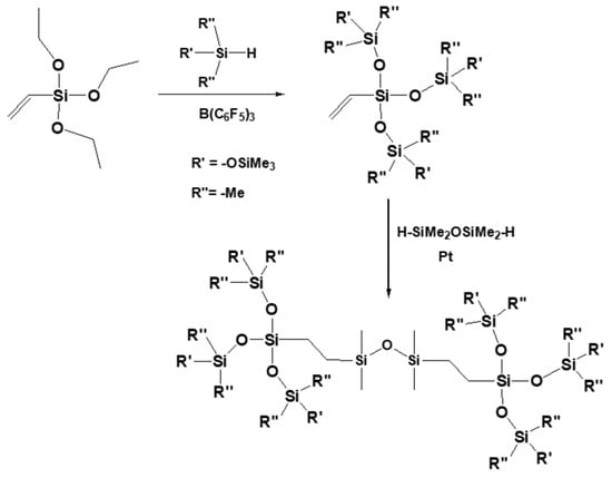 - Chojnowski, J.; Rubinsztajn, S.; Fortuniak, W.; Kurjata, J. Synthesis of Highly Branched Alkoxysiloxane–Dimethylsiloxane Copolymers by Nonhydrolytic Dehydrocarbon Polycondensation Catalyzed by Tris(pentafluorophenyl)borane. Macromolecules 2008, 41, 7352–7358. [Google Scholar] [CrossRef]