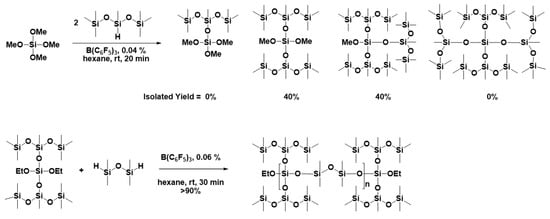 The P-R reaction is often a unique method for the synthesis of branched polysiloxanes with a high degree of control of the macromolecule microstructure. Brook et al. showed that branched polsiloxanes of a complex 3D architecture may be built with a high yield [26,77]. Star oligosiloxane tetrakis(pentamethyldisiloxane)silane was obtained with the P-R condensation of pentametyldisiloxane with tetrapropoxysilane with a 97% yield under mild conditions, and the oligomer with an even more branched structure was obtained at 60 °C with the yield of 94% (Scheme 14). Under the conditions used in these reactions, no products of the metathetic exchange of functional groups were detected [77].