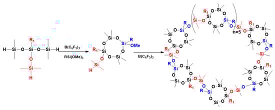 Some other reactions of SiH reagents promoted by TPFPB are also related to P-R reactions. Zhang and Brook showed that pentamethyldisiloxane can break the organodisulfide bridges in silicone elastomers with TPFPB as a catalyst [28]. Rubinsztajn used the same catalyst to react diphenylsilane with trimethyl borate and make a highly branched borosiloxane resin with SiOB bonds [29]. Drozdov et al. followed this method to cross-link SiH-containing polysiloxanes with di- or trifunctional alkyl borates and produced various polyborosiloxane materials [30].