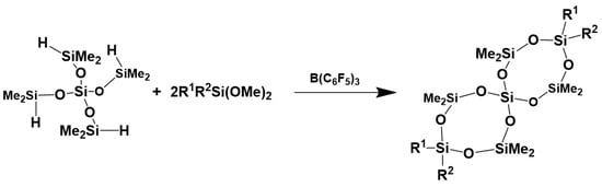 - Chojnowski, J.; Fortuniak, W.; Kurjata, J.; Rubinsztajn, S.; Cella, J.A. Oligomerization of Hydrosiloxanes in the Presence of Tris(pentafluorophenyl)borane. Macromolecules 2006, 39, 3802–3807. [Google Scholar] [CrossRef]
