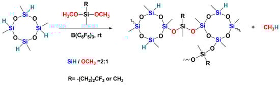 - Zhu, H.; Hiruta, S.; Demirci, A.; Kim, S.; Hoshino, N.; Akutagawa, T.; Mitsuishi, M. Effects of Hydride Transfer Ring-Opening Reaction on B(C6F5)3 Catalyzed Polymerization of D4H Cyclosiloxane and Dialkoxysilanes toward Thermally Stable Silsesquioxane–Siloxane Hybrid Materials. Macromolecules 2022, 55, 10134–10144. [Google Scholar] [CrossRef]