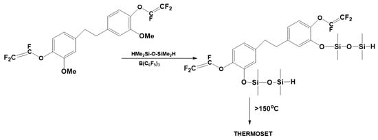 A siloxane star oligomer that is functionalized with trifluorovinyl ether groups capable of cyclodimerization at a high temperature was synthesized with a high yield using the P-R reaction of tetraethoxysilane with (trifluorovinyloxyphenyl)dimethyl silane, as shown in Scheme 12B [73]. The obtained compound was transformed with high-temperature treatment into a transparent, flexible siloxane film with a low dielectric constant and high UV absorption below 350 nm, which makes it a promising material for UV-blocking coatings and a matrix resin for microelectronics.