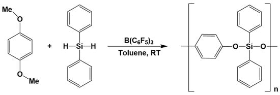 - Cella, J.; Rubinsztajn, S. Preparation of Polyaryloxysilanes and Polyaryloxysiloxanes by B(C6F5)3 Catalyzed Polyetherification of Dihydrosilanes and Bis-Phenols. Macromolecules 2008, 41, 6965–6971. [Google Scholar] [CrossRef]