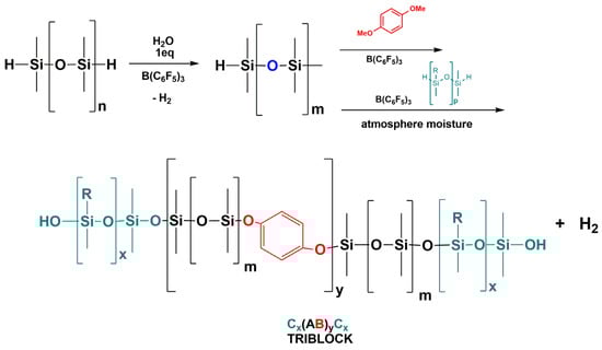 - Schneider, A.F.; Laidley, E.; Brook, M.A. Facile Synthesis of Cx(AB)yCxTriblock Silicone Copolymers Utilizing Moisture Mediated Living-End Chain Extension. Macromol. Chem. Phys. 2019, 220, 1800575. [Google Scholar] [CrossRef]