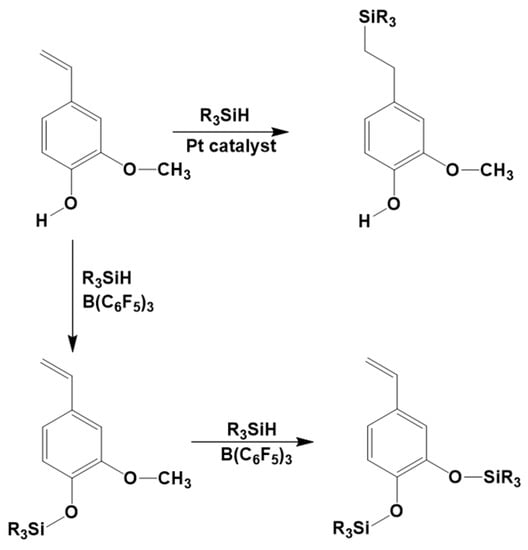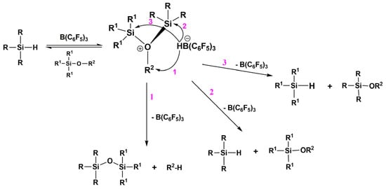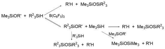 B(C6F5)3 is often considered to be stable under P-R conditions. However, a decrease in its activity was observed, especially in the case of slower P-R reactions and a low TPFPB concentration. TPFPB reacts with the SiH reagent, substituting one C6F5- group on silicon, forming HB(C6F5)2 that is catalytically inactive in P-R reactions [55]. Kinetic studies of this reaction showed that its rate depends on organic groups bonded to silicon [56].