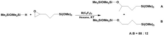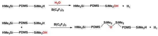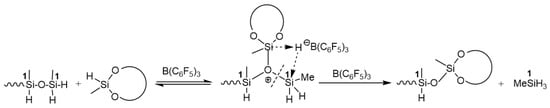 The induction period in the P-R reaction was not observed when water-free TPFPB was added to the solution of alkoxysilane and hydrosilane, even containing a small amount of water. This means that water cannot compete well with the complexation of the SiH compound by borane under these conditions [48]. In studies of the hydride transfer ring-opening polymerization of hexamethylcyclotrisiloxane, D3, in toluene initiated with PhMe2SiH in the presence of TPFPB, an induction period was observed after adding the catalyst to the solution of the monomer and initiator. Ganachaud et al. reported that a condensation of dimethyldimethoxysilane with 1,1,3,3-tetramethyldisiloxane in an aqueous emulsion in the presence of TPFPB yields a high-molecular-weight polysiloxane polymer [49,50]. This reaction did not occur with HCl, which seems to show that it was not catalyzed by a Brönsted acid. A complex process with three TPFPB-catalyzed condensation reactions, SiH + SiOMe, SiH + SiOH and SiOH + SiOH, leading to the formation of a siloxane bond, was suggested.