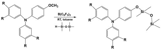 - Kamino, B.A.; Grande, J.B.; Brook, M.A.; Bender, T.P. Siloxane–Triarylamine Hybrids: Discrete Room Temperature Liquid Triarylamines via the Piers–Rubinsztajn Reaction. Org. Lett. 2011, 13, 154–157. [Google Scholar] [CrossRef]