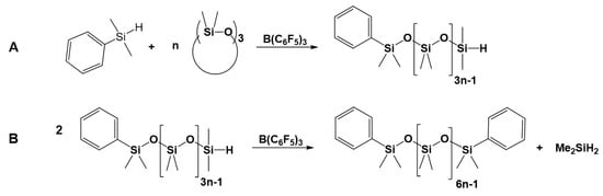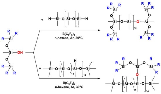 There are many methods for the synthesis of polysiloxanes, but many of them are difficult to control and require the use of heavy-metal catalysts, which are difficult to remove from the polymer and may deteriorate the properties of the final products. Some syntheses require a high temperature, and a large amount of undesired cyclic oligomers are usually formed in these reactions. It is difficult to obtain copolymers with regular chain microstructures. The P-R reaction provides new synthetic methods to overcome these problems. TPFPB is a very efficient catalyst operating at an ambient temperature and produces a volatile hydrocarbon as the condensation byproduct. The P-R condensation is often used to obtain polymer chain structures that are not available or difficult to obtain with other methods. The P-R reaction is often a unique method for the synthesis of polysiloxanes with a high degree of control of the macromolecule microstructure. In the following subsections, the current developments in this field will be presented.