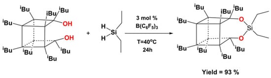- Kaźmierczak, J.; Lewandowski, D.; Hreczycho, G. B(C6F5)3-Catalyzed Dehydrocoupling of POSS Silanols with Hydrosilanes: A Metal-Free Strategy for Effecting Functionalization of Silsesquioxanes. Inorg. Chem. 2020, 59, 9206–9214. [Google Scholar] [CrossRef]