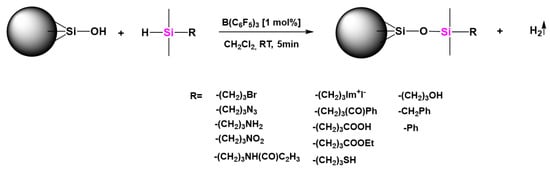 - Moitra, N.; Ichii, S.; Kamei, T.; Kanamori, K.; Zhu, Y.; Takeda, K.; Nakanishi, K.; Shimada, T. Surface Functionalization of Silica by Si–H Activation of Hydrosilanes. J. Am. Chem. Soc. 2014, 136, 11570–11573. [Google Scholar] [CrossRef]