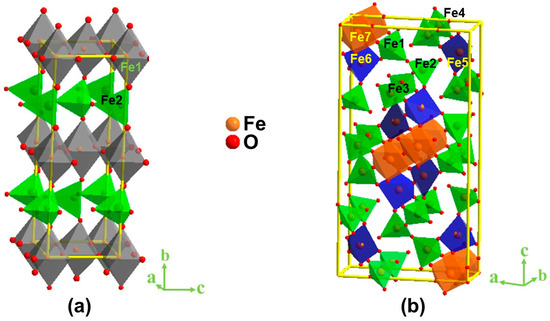 Crystal structures of (a) Sr2Fe2O5 and (b) Ba2Fe2O5. The former has two crystallographically distinct Fe sites, while the latter has seven distinct Fe sites. The A-site atoms residing in spaces between the above polyhedra are omitted for clarity.