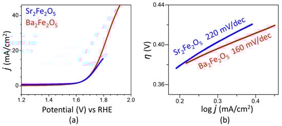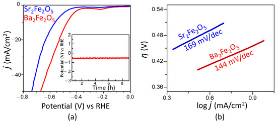 The electrocatalytic activities of the two materials for OER are represented by the polarization curves in Figure 2a. As observed in this plot, the two compounds show a similar onset potential at about 1.6 V. The overpotential for OER is calculated as η10 = ERHE − 1.23 V, where ERHE is the potential versus RHE at 10 mA/cm2, and 1.23 V is the thermodynamic potential for OER. The overpotential for Ba2Fe2O5 (0.50 V) is slightly lower than that of Sr2Fe2O5 (0.52 V). Importantly, the utilization of Ba2Fe2O5 as a catalyst leads to a current response, which is several-folds greater than that obtained using Sr2Fe2O5. This indicates the significantly higher electrocatalytic activity of Ba2Fe2O5 compared to Sr2Fe2O5. The OER activity of Ba2Fe2O5 is retained for many hours, as shown in the chronopotentiometry data in the inset of Figure 2a, indicating the stability of this catalyst. The kinetics of electrochemical reactions can be evaluated using the Tafel equation, η = a + b log j, where η is overpotential and j is current density. The linear fit of the plot of η versus log j, using the overpotential from the curved region of the polarization curve, will give the Tafel slope [25,36,37,38,39]. Faster reaction kinetics is associated with a smaller Tafel slope, indicating a more facile electron transfer. As shown in Figure 2b, the Tafel slope for Ba2Fe2O5 is smaller than that of Sr2Fe2O5, indicating a faster OER process, which is consistent with the higher electrocatalytic activity of Ba2Fe2O5.