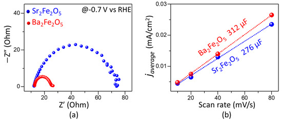We have also evaluated the double-layer capacitance, Cdl, in the non-faradic region [42], where the current is generated mainly from electrical double layer charge and discharge, without contributions from electrode reactions [42,43]. The importance of Cdl is that it is directly related to the electrochemically active surface area [42,44,45,46]. The value of Cdl is determined from the equation Cdl = javerage/ν [47,48], where javerage is the average of the absolute values of the anodic and cathodic current-densities at the middle potential of the CVs in a non-faradic region (Figure S2). The slope of the plot of javerage vs. scan rate gives the Cdl. As shown in Figure 4b, Cdl was calculated from CVs at scan rates of 10, 20, 40, and 80 mV/s. Ba2Fe2O5 shows a greater Cdl value, which is consistent with its higher electrocatalytic activity compared to Sr2Fe2O5.