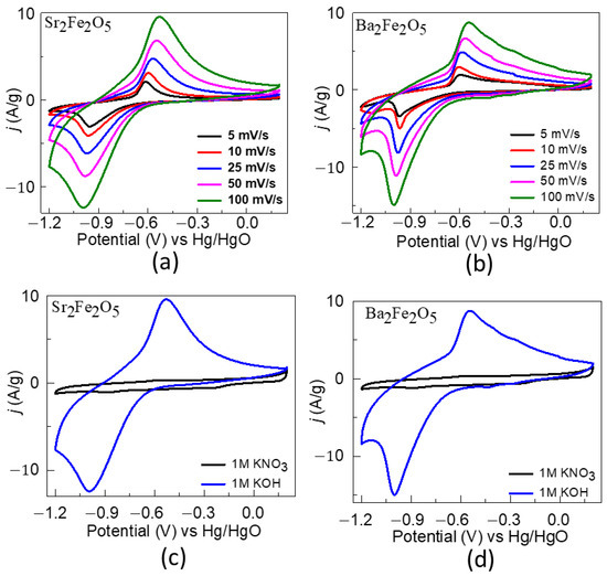 The pseudocapacitive properties for the two materials were studied using the cyclic voltammetry data in a three-electrode cell configuration at scan rates of 5, 10, 25, 50, and 100 mV/s, as shown in Figure 5. The redox peaks are indicative of the faradaic reactions [24,52,53,54]. The redox peaks correspond to the Fe2+/3+ redox behavior for both compounds [52]. As observed in the CVs, as the scan rate increases, the oxidation peak shifts toward higher potentials and the reduction peak toward lower potentials. Such shifts occur due to the internal resistance of the electrode [55,56]. Moreover, the higher intensities of the redox peaks at higher scan rates are ascribed to the fast electronic and ionic transports [50,57]. Importantly, the redox peaks are not observed in a KNO3 solution (Figure 5), confirming that the faradaic processes arise from the oxide ion intercalation facilitated by OH- in an alkaline electrolyte [52].