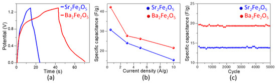 In this equation, I is the constant applied current, is the potential window, is the discharge time, and m is the total mass of the material loaded on both electrodes. The GCD experiments were done at various current densities, 0.5, 3, 5 and 10 A/g. The Cs values at each current density are shown in Figure 6b. As commonly observed in pseudocapacitors, the Cs decreases with the increase in current density [27,28]. At the current density of 0.5 A/g, the Cs values for Sr2Fe2O5 and Ba2Fe2O5 are ~31 F/g and ~42 F/g, respectively, indicating the significantly higher pseudocapacitive properties of the latter material. The specific capacitance from the symmetric cell of Ba2Fe2O5 is also superior to those of several previously reported oxide pseudocapacitors, such as La0.5Ca0.5MnO3 [27] and La0.85Sr0.15MnO3 [28], which show the respective specific capacitance values of ~6.5 F/g and less than ~8 F/g for symmetric cells at 0.5 A/g.