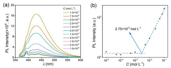 Then, the fluorescence behavior of the MAC solutions was studied. The fluorescence intensity of the MAC ethanol solution increased with the increased concentration (Figure 2a), with a critical cluster concentration [32] of 2.75 × 10−3 mol L−1 (Figure 2b). When the concentration was lower than the CCC, the clusters were yet not completely formed and thus the PL intensity hardly changed. Meanwhile, above the CCC, clusters were formed and their number increased with the increased concentration, leading to the increase in fluorescence intensity. The UV−visible (UV−VIS) spectra of MAC ethanol solutions with different concentrations (Figure 2c and Figure S4) further prove the CCC. The shoulder peak at about 350 nm was attributed to the clusters. In the first stage below 2.75 × 10−3 mol L−1, the absorbance grew slower than in the second stage (Figure 2d). For comparison, MPB was still non-emissive in solutions (Figure S5). As shown in the UV−VIS spectra (Figure 2e and Figure S6), when the concentrations were both 5.0 × 10−2 mol L−1, MPB had a lower absorption than MAC over 350 nm, which means that the extent of aggregation of MPB was lower than that of MAC.