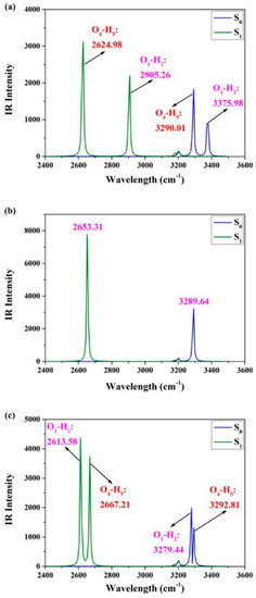 In order to further qualitatively reveal the changes in the hydrogen bonding interactions after photoexcitation, we further investigated the infrared (IR) stretching vibration behavior of the hydroxyl moieties (O1-H2 and O4-H5) of the double hydrogen bonds. Considering the practicability and correctness of the IR vibration spectrum for clarifying the strength of the chemical bonds between the ground state and the excited states [39,40,41,42,43,44,45], the IR results of the BBTHQ-SO, BBTHQ-SS and BBTHQ-SSe are shown in Figure 2. Obviously, the stretching IR results of the hydroxyl group all showed a redshift in the S1 state, which reveals that photoexcitation can indeed cause excited-state hydrogen bonding interactions to become stronger. It is noteworthy that for BBTHQ-SO, the IR of the O4-H5 had a larger redshift than that of the O1-H2—while for BBTHQ-SSe, the IR of the O1-H2 showed a larger redshift than that of the O4-H5.