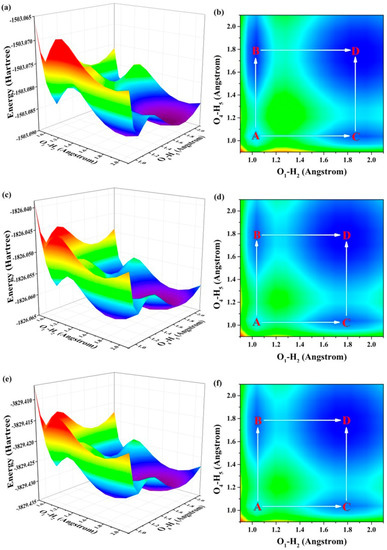 (a) Constructed S1-state PES for BBTHQ-SO; (b) The projective plane of the S1-state PES of BBTHQ-SO; (c) Constructed S1-state PES for BBTHQ-SS; (d) The projective plane of the S1-state PES of BBTHQ-SS; (e) Constructed S1-state PES for BBTHQ-SSe; (f) The projective plane of the S1-state PES of BBTHQ-SSe. The minimum points (A, B, C, and D) have been marked on the projective plane, respectively.