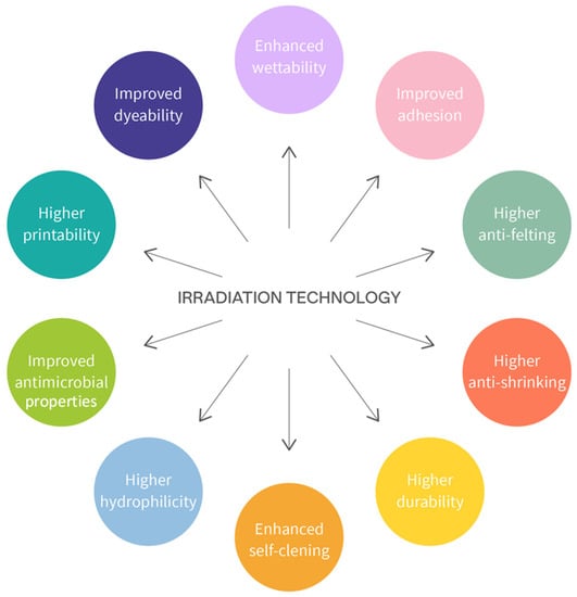 In fact, these innovative technologies are essentially fast, low-temperature processes, which require low amounts of water and chemicals. Irradiation technologies are used in dyeing and finishing to modify the textile surface and impart different qualities and functional properties without affecting the bulk properties of the material. For example, they are used to improve adhesion, dyeability, fastness properties, resistance to wrinkling, and susceptibility to microbial attacks. In Figure 4, various effects of irradiation technologies on textile materials are shown [91].