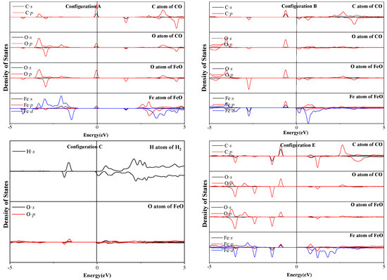 The adsorption of CO/H2 onto FeO to generate surface active compounds is the crucial step for reduction. Considering the structures of adsorbate and adsorbent, three CO–FeO configurations (C bond to the O atom of FeO forming CO2 compounds) and one H2–FeO configuration (H bond to the O atom of FeO forming H2O compounds) were explored to investigate the interaction mechanism. The partial state density (PDOS) of configurations A, B, C, and E were calculated, as shown in Figure 3.
