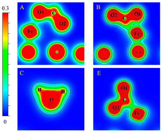 For the H2–FeO system (configuration C), the population of H and O is 1s0.62. The rearrangement of electrons is due to the transfer of electrons from the H atom to the O atom, forming two H–O bonds. This chemical adsorption of the O atom by H2 produces compounds of H2O.