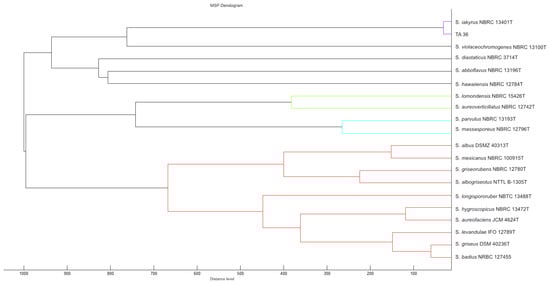 MSP dendrogram of tested Streptomyces strain and relatedness of TA 36 strain to S. iakyrus DSM 40482. The closest relationship of individual strains tested is indicated by colour differentiation of individual clusters.