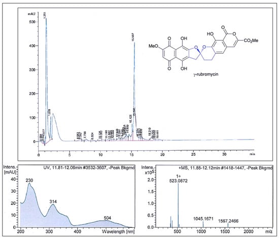 Comparison of the fractionation RP–HPLC chromatogram of γ–rubromycin, UV spectra with the max. at 314 nm and the ESI–HRMS spectrum showing the prominent ion clusters.