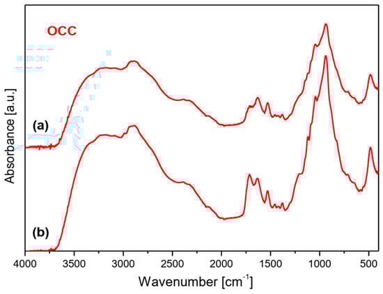 FTIR spectra of films produced by crosslinking of magnesium phytate with OCC and NOCC chitosan derivatives. Top layer (a) and bottom layer (b) of membrane.