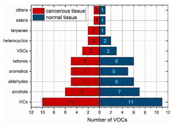 The distribution of the VOCs according to their chemical classes in both types of samples was similar. The most abundant classes of VOCs in both tissue types were hydrocarbons (25%) and alcohols (15%), followed by aldehydes, ketones, and aromatics. The number of detected compounds per sample varied between subjects and ranged from 28 to 77 (median 49).