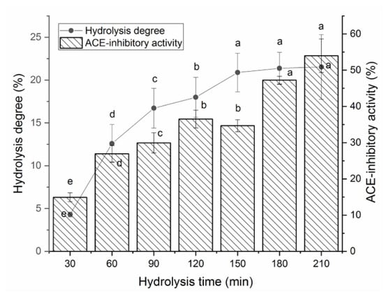 The hydrolysis degree and ACE-inhibitory activity of almond albumin hydrolysates at different hydrolysis times. Different letters (a–e) between the groups marked a statistically significant difference (p < 0.05).