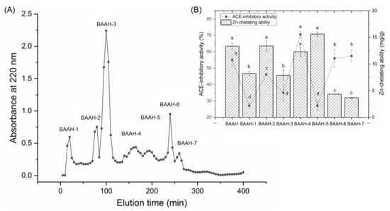 (A) The chromatographic separation diagram of almond albumin hydrolysates (BAAHs) on Sephadex G-15 gel column, and (B) zinc ion-chelating ability and inhibiting capacity against ACE of the separated main peaks separately named as BAAH-1, BAAH-2, BAAH-3, BAAH-4, BAAH-5, BAAH-6, and BAAH-7. Different letters (a–d) between the groups marked a statistically significant difference (p < 0.05).