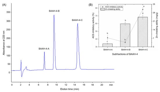 (A) The chromatographic separation diagram of BAAH-4 in reverse-phase high-performance liquid chromatography system, and (B) the zinc ion-chelating ability and inhibiting capacity against ACE of the obtained main subfractions named as BAAH-4-A, BAAH-4-B, and BAAH-4-C. Different letters (a–c) between the groups marked a statistically significant difference (p < 0.05).