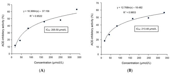 (A) The inhibitory effects of RPPSEDEDQE on ACE at different doses, and the fitting equation; and (B) the inhibitory effects of RPPSEDEDQE on ACE at different doses, and the fitting equation after the hydrolysis of gastrointestinal enzymes.