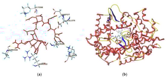 In this study, the docking modes of BAAH peptides toward ACE were simulated and virtually screened at the molecular level using a molecular modeling tool. The local diagram and global diagram of the best mode (with the highest T-score) are separately shown in Figure 6a,b. Hydrogen bonds were observed between seven active sites of ACE (Lys368, Asp377, Glu376, Pro508, Thr282, Arg522, and Lys454) and RPPSEDEDQE (Figure 6a and Table 3). Hydrogen bonding is a common but very important force between peptides and ACE. Generally, the length of the hydrogen bond was inversely proportional to the force between the peptides and ACE [5,7]. Thus, the short length of the hydrogen bonds between ACE and RPPSEDEDQE (1.94–2.91 Å) suggested that the binding power of RPPSEDEDQE toward ACE was strong. More importantly, the T-score for the best docking mode of BAAH peptides toward ACE (8.06) was above the threshold (6.0), reflecting a strong binding power of RPPSEDEDQE toward ACE. Additionally, hydrophobic interactions were observed between RPPSEDEDQE and fifteen residues in ACE (Table 3). These results were consistent with the high inhibitory effect against ACE (IC50: 205.50 μmol·L−1).