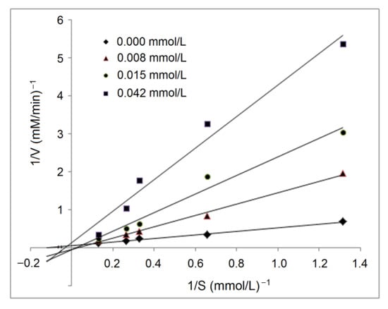 Furthermore, the Lineweaver–Burk plot of ACE against different concentrations of N-hippuryl-L-histidyl-L-leucine (0.13, 0.26, 0.33, 0.66, and 1.32 mmol·L−1) was drawn [30]. Both Km (Michaelis–Menten constant) and the max reaction velocity (Vm) were calculated to analyze the inhibition kinetic of BAAH peptides (0.008, 0.015, and 0.042 mmol·L−1) against ACE.