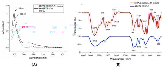 In the current study, ultraviolet wavelength scanning and Fourier-transformed infrared spectroscopy were both employed to analyze the binding mode of RPPSEDEDQE to zinc ion. The ultraviolet adsorption peak of RPPSEDEDQE moved from 199 nm to 206 nm after the zinc chelation (Figure 8A), demonstrating the combination between zinc ions and RPPSEDEDQE [34]. Chelation with zinc ions can cause electronic transitions of peptides’ chromophoric groups, thereby resulting in a red- or blue shift of the ultraviolet adsorption peak of peptides [35].