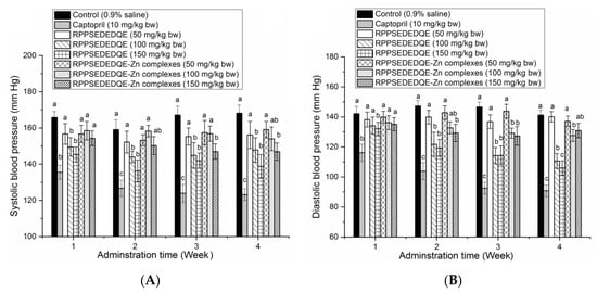 RPPSEDEDQE remarkably lowered the diastolic blood pressure of SHR at 150 mg/kg body weight after one week of oral administration (p < 0.05). RPPSEDEDQE–Zn complexes with a high dose (150 mg·kg bw−1) decreased the diastolic blood pressure after two weeks of administration. However, a low dose of RPPSEDEDQE and RPPSEDEDQE–Zn complexes did not offer any reducing effect on the diastolic blood pressure of SHR. At the same dose, RPPSEDEDQE’s reducing effects on the systolic blood pressure and the diastolic blood pressure were both better than that of RPPSEDEDQE–Zn complexes. Moreover, the reducing efficiency of RPPSEDEDQE and RPPSEDEDQE–Zn complexes on the diastolic and systolic blood pressure were both much lower than that of the positive control (Captopril, a famous antihypertensive drug) (p < 0.05) [7].