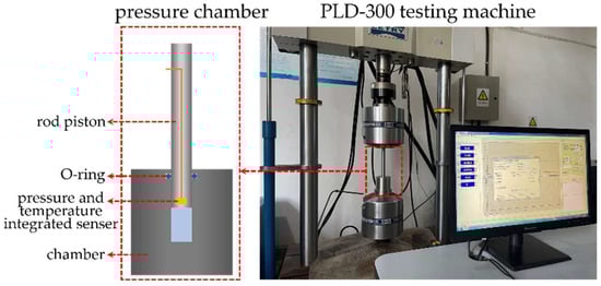 The pressure induced infiltration tests were performed on a pressure-specific volume test bench, as depicted in Figure 1, comprising primarily a loading system and a pressure chamber. The loading system employed was a PLD-300 electro-hydraulic servo fatigue testing machine. The pressure–volume test chamber consisted of a chamber and a rod piston, both made of stainless steel. A specially carved O-ring slot was incorporated near the top surface of the pressure chamber to ensure effective sealing between the chamber and the rod piston. Additionally, at the base of the rod piston, an integrated sensor for measuring real-time changes in both pressure and temperature was embedded.
