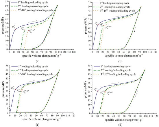 After the first loading/unloading loop of the NEASs in this study, the unloading pressure-specific volume characteristic curve does not return to its initial point when the pressure returns to 0.1 MPa. This suggests that the porous material in the system may have undergone permanent structural collapse damage due to compressive loading or that liquid molecules/ions infiltrating into a state cannot flow out and remain trapped within pores. It is generally believed that both causes contribute to volume loss after the first loading–unloading loop, while subsequent loops’ volume loss is only related to liquid molecules/ions retention.