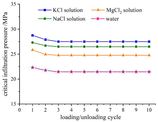 The infiltration pressure of ten loading–unloading loops in the four studied systems is depicted in Figure 3. It should be noted that aqueous electrolytes exhibit higher surface tensions compared to pure water [23]. Consequently, the infiltration pressure Pin = 4γ/d [24] will inevitably increase due to the enhanced surface tension of the aqueous electrolytes.