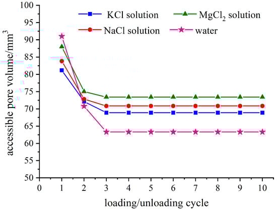 Effect of ion species on accessible pore volume under ten cyclic loadings(NEASs tested are water/zeolite, KCl solution/zeolite, NaCl solution/zeolite, and MgCl2 solution/zeolite; loading rate is 0.02 mm/s).