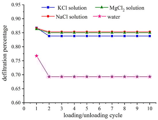 Effect of ion species on defiltration percentage under ten cyclic loadings (NEASs tested are water/zeolite, KCl solution/zeolite, NaCl solution/zeolite, and MgCl2 solution/zeolite; loading rate is 0.02 mm/s).