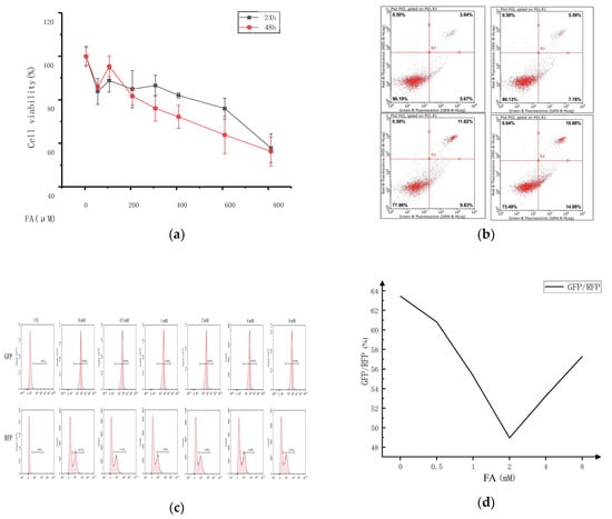 The pMRX-IP-GFP-LC3-RFP-LC3ΔG (RRID: Addgene _84572) plasmid was used as a template to amplify the GFP-LC3-RFP-LC3ΔG fragment, and then the PCR product was digested by NheI/BamHI and connected to the pCDH-RFP-GFP-hLC3B-EF1-Puro (BioVector NTCC Inc) plasmid to obtain the pCDH-GFP-LC3-RFP-LC3ΔG-Puro plasmid. The plasmid was efficiently transferred into cells through lentivirus transduction and showed stable expression. GFP-LC3-RFP-LC3ΔG cells were plated at a density of 1.2 × 105 in each well. After culture for 24 h to allow for cell adhesion, different concentrations of FA were added into each well, and after 24 h of exposure of the cells to the FA, the samples were collected by PBS and analyzed using flow cytometry.