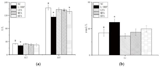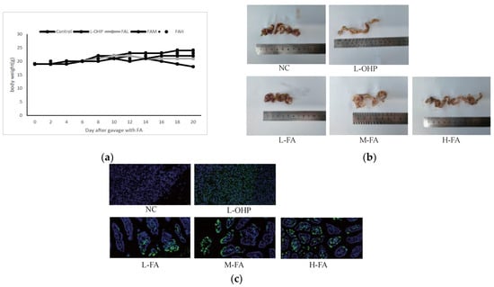 Figure 2b,c). To determine whether the FA administration induced toxicity, indicators of liver and kidney function, namely alanine aminotransferase, aspartate aminotransferase, and creatinine, were measured, along with changes in body weight during gavage. FA doses of 20 mg/kg and 40 mg/kg resulted in no significant changes, while 80 mg/kg had a significant effect (