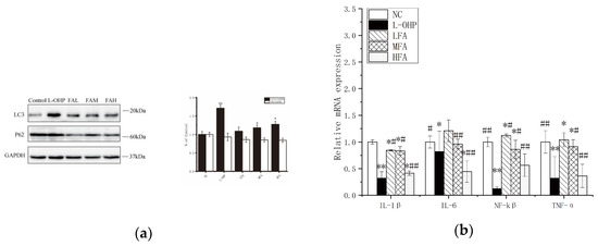 Figure 4b), and changes in the mRNA expression levels of inflammatory response pathway-related molecules and first responders of inflammation, such as NF-κB, TNF-α, and IL-1β, were detected. The mRNA expression levels of these proteins in the FA group decreased after administration, indicating that the inflammatory effect of cancer was slowed compared to the normal group.