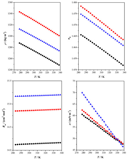 Density, ρ, refractive index, nD, molar refraction, Rm, and surface tension, σ, as a function of temperature, T, at atmospheric pressure, p = 0.1 MPa for the studied compounds: xylitol: glycerol: water (●) experimental; fructose: glycerol: water (■) experimental; sorbitol: glycerol: water (▲) experimental; (____) correlated values.