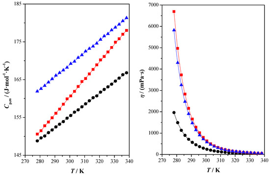 Finally, the fluidity of the studied DESs has been obtained through kinematic viscosity, ν. Using experimental density values, the dynamic viscosity property, η, was obtained. Viscosity is a transport property that describes the internal resistance of a fluid to shear stress [49]. It is a mole- and temperature-dependent property. It is important to establish a viscosity database as this property is directly related to fluid flow calculations and equipment design. With these data at the design stage, the DES compound can be designed to achieve lower viscosity values [50].