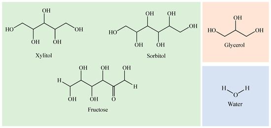 Table 3 shows all the initially prepared systems. It can be seen that all the analyzed systems were liquid at room temperature and 4 °C, so a decrease in melting temperature was observed. The mixtures were very viscous and difficult to work with; it was decided to add water to make them easier to handle. Of all the ternary systems containing water, those marked with an asterisk* were selected to be studied in depth because they were less viscous than the others. Therefore, DESs formed via the combination of xylitol, fructose and sorbitol with glycerol and water in the molar ratio 1:2:3 have been studied. Once the compounds were prepared, the properties were measured.